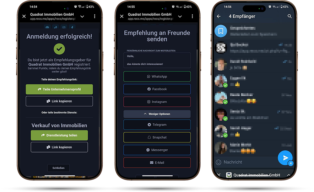 Interessierte Kontakte deines Empfehlungsgebers nehmen mit nur einem Klick Kontakt zu dir auf und werden so schnell zu neuen Kunden. Nach Abschluss der Empfehlung erhält der Neukunde direkt deinen Google-Bewertungslink sowie eine Einladung zum Empfehlungsprogramm – und kann so selbst sofort zum nächsten Empfehlungsgeber werden.